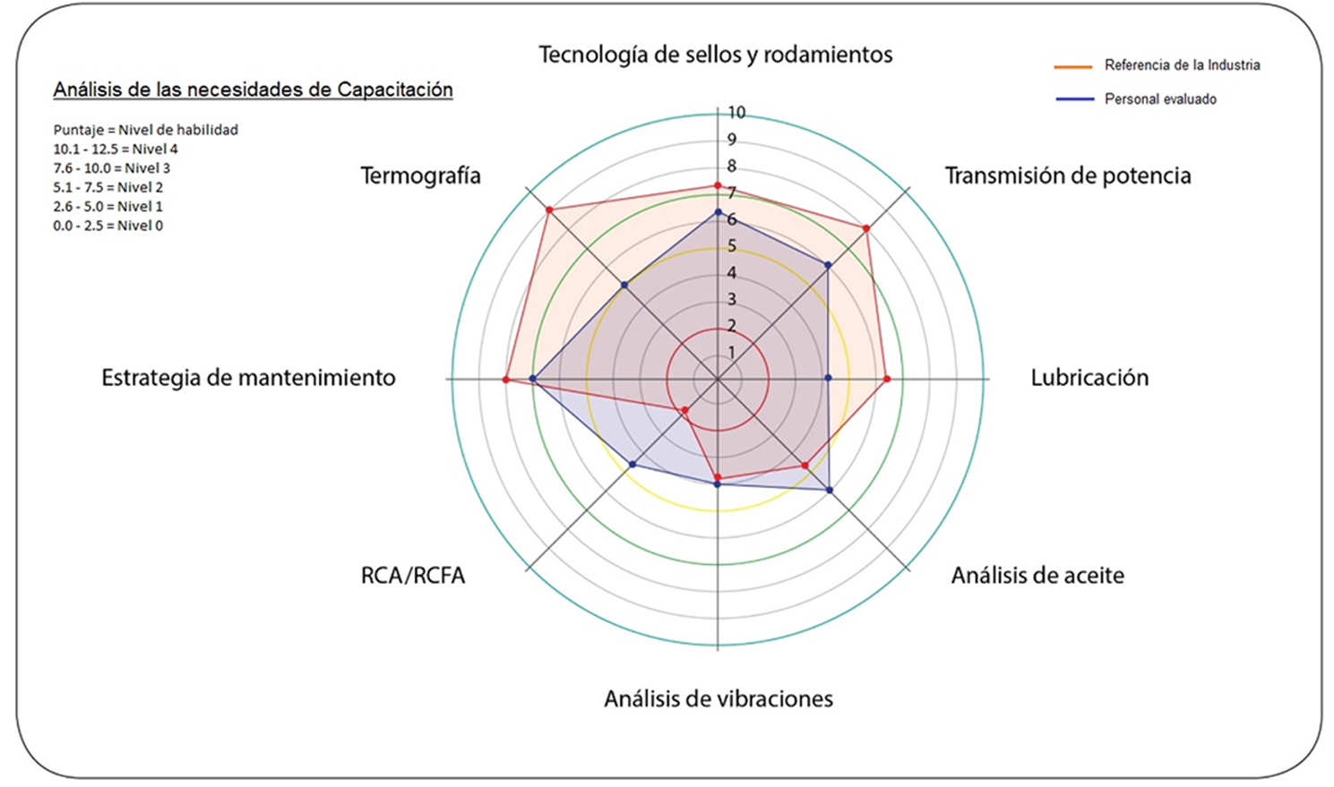 Un diagrama de araña que muestra la valoración detallada para cada área de competencia, las oportunidades de mejora detectadas y las áreas de desempeño excepcional (ver gráfico de referencia).
